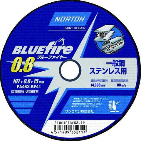 ・砥材:FA(特殊熱処理アルミナ)・粒度(#):46・硬度:X・外径(mm):107・刃厚(mm):0.8・穴径(mm):15.0・最高使用回転数(rpm):14300・最高使用周速度(m/min):80