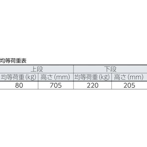 ・均等荷重(kg):300・長さ(mm):915・幅(mm):615・高さ(mm):205・ハンドル高さ(mm):850・キャスター径(mm):130・適合ストッパー:300NKB、300NS、300NJB・取替キャスター(自在):TR-130J・取替キャスター(固定):TR-130K・タイプ:固定式簡易2段ハンドルタイプ・下段有効高さ(mm):488・上段高さ(mm):705・上段均等荷重(kg):50・下段高さ(mm):205・下段均等荷重(kg):220・組立目安:1人20分