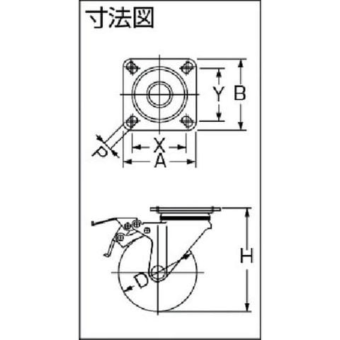 ・車輪径D(mm):100・タイプ:自在式(ストッパー付)・許容荷重(daN):120・許容荷重(kgf):122.4・車輪幅(mm):32・取付高H(mm):132・取付座A(mm):90・取付座B(mm):90・取付ピッチX(mm):68~71・取付ピッチY(mm):68~71・取付穴径P(mm):11・許容荷重(N):1200