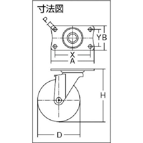 ・車輪径D(mm):125・タイプ:自在式・許容荷重(daN):70・許容荷重(kgf):71.4・車輪幅(mm):25・取付高H(mm):148・取付座A(mm):100・取付座B(mm):58・取付ピッチX(mm):82・取付ピッチY(mm):40・取付穴径P(mm):8.8