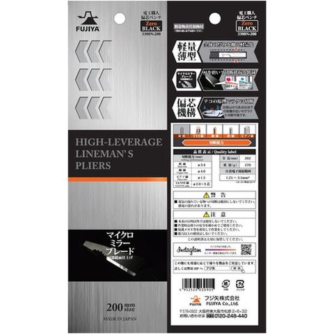 3300N200 フジ矢(株) フジ矢 電工職人偏芯ペンチ Zero Black 全長202mm