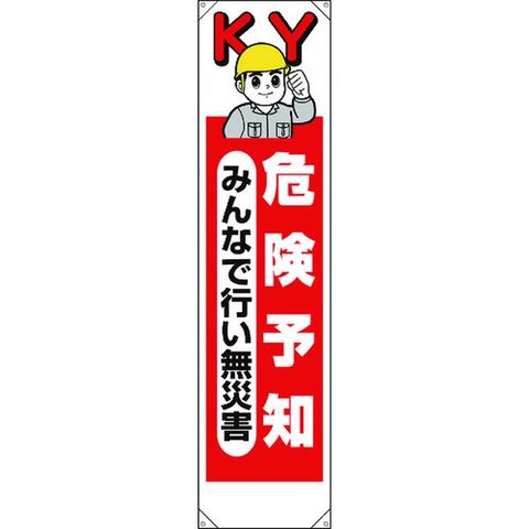 ・表示内容:危険予知 みんなで行い無災害・取付仕様:穴4ヵ所・縦(mm):1800・横(mm):450・ハトメ穴内径(mm):10