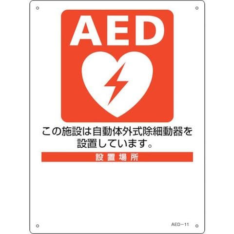 ・表示内容:AED設置場所・取付仕様:穴4ヵ所・縦(mm):300・横(mm):225・厚さ(mm):1・タイプ:標準・取付方法:ビス止めまたはテープ止め(ビス、テープ別売)