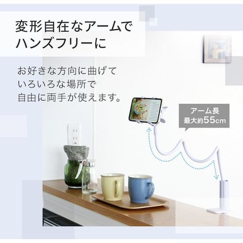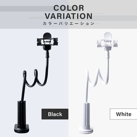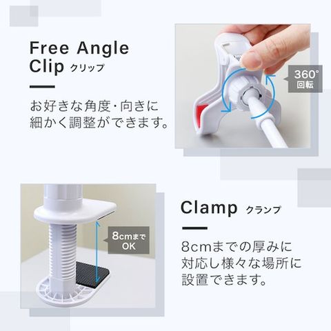 ・手持ちせずにスマートフォンを固定できるハンズフリースタンドです。・スマートフォンを固定しておくことができるフレキシブルで変幻自在なアームを採用しています。・スマートフォンをクリップした部分は角度調整することができ、スマートフォンを好きな角度で固定することができます。・クランプの部分は最大8cmの厚みがあれば挟み込むことが可能です。・クリップ部分には端末を固定・保護するためのシリコンパッドがついています。