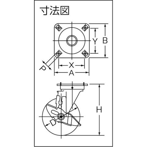 ・車輪径D(mm):150・タイプ:自在式(ストッパー付)・許容荷重(daN):160・許容荷重(kgf):163.2・車輪幅(mm):40・取付高H(mm):190・取付座A(mm):102・取付座B(mm):102・取付ピッチX(mm):75~80・取付ピッチY(mm):75~80・取付穴径P(mm):11