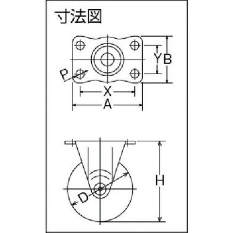 ・車輪径D(mm):50・タイプ:固定式・許容荷重(daN):30・許容荷重(kgf):30.6・車輪幅(mm):20・取付高H(mm):65・取付座A(mm):58・取付座B(mm):40・取付ピッチX(mm):45・取付ピッチY(mm):25・取付穴径P(mm):6.5・許容荷重(N):300