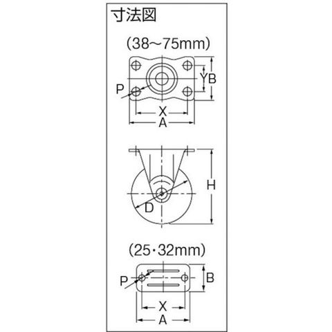 ・車輪径D(mm):32・タイプ:固定式・許容荷重(daN):18・許容荷重(kgf):18.36・車輪幅(mm):14・取付高H(mm):42・取付座A(mm):36・取付座B(mm):20・取付ピッチX(mm):29(2穴)・取付穴径P(mm):4.2・許容荷重(N):180