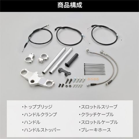 トップブリッジ、ハンドルクランプ、ハンドル、ハンドルストッパー、スロットルスリーブ、クラッチケーブル、スロットルケーブル、ブレーキホース