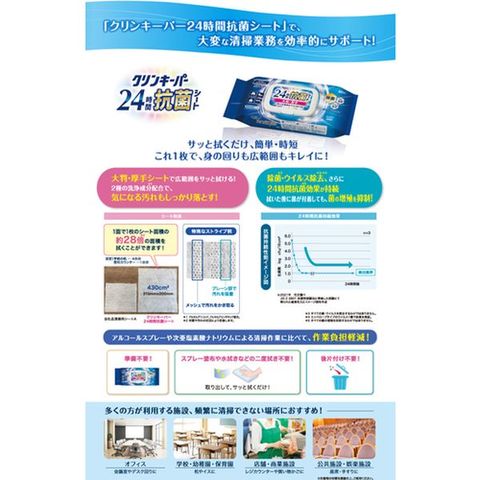 ・1枚で汚れ洗浄、除菌*1、ウイルス除去*1*2ができ、さらに24時間抗菌*3効果が持続する環境清掃用シートです。・拭いた後に菌が付着しても、菌の増殖を抑えることができます。・大判厚手シートなので、身の回りはもちろん、広範囲の清掃にも便利です。・*1すべての菌・ウイルスを除去するわけではありません。・*2エンベロープタイプのウイルス1種で効果を検証。・*3すべての菌の増殖を抑制するわけではありません。