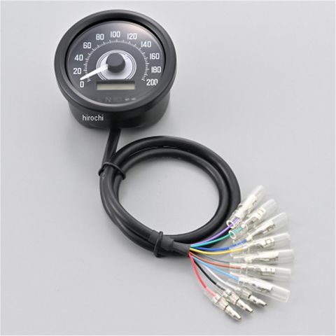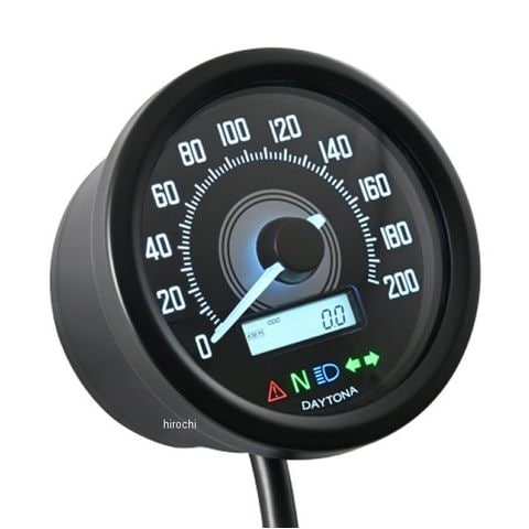 球面レンズを採用したニードルタイプのインジケーター付き電気式スピードメーター。φ60の薄型ステンレスボディ仕様。5種類のインジケーターを内蔵(警告灯/ニュートラル/ハイビーム/ウインカー左/ウインカー右)。また、パネル内のサブモニターは、ODO/TRIP1/TORIP2/最高速記憶(ピークメモリー)/電圧を選択して表示可能。