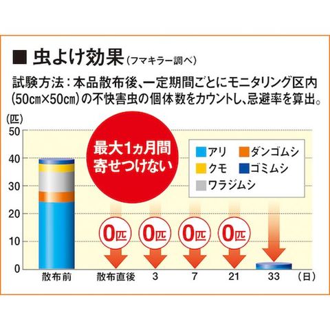 ・根まで枯らす持続除草成分と、速攻除草成分を配合しています。・虫よけ効果1ヶ月です。・(ユスリカ、アリ、ダンゴムシ、ワラジムシ、ムカデ)・最速5分で枯れます。・這う虫を速攻退治します。