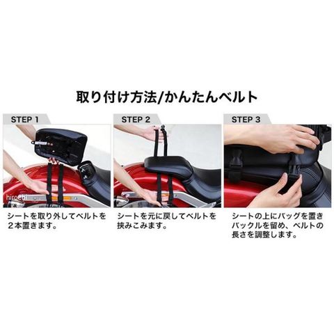 車載バッグ取り扱いについては、タグに記載の取付説明通りに取り付けを行い、走行前には都度ご自身で取付安全確認を行ってください。記載以外の弊社が意図しない取付方法により生じた事柄に関わる一切の破損や不具合・事故に関して、弊社では補償致しかねます。