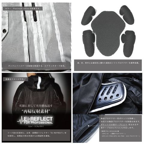 ・フード部の反射材に、広角・高輝度リフレクター「Ei REFRECT」材を使用し、夜間走行時の外部からの視認性を確保。