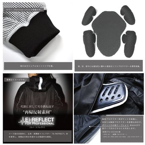 ・フード部の反射材に、広角・高輝度リフレクター「Ei REFRECT」材を使用し、夜間走行時の外部からの視認性を確保。