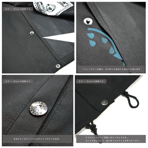 表地:ポリエステル(超撥水Ei コーティング仕様)+ 防風フィルム(ポリエステルナイロン)+シームテープ