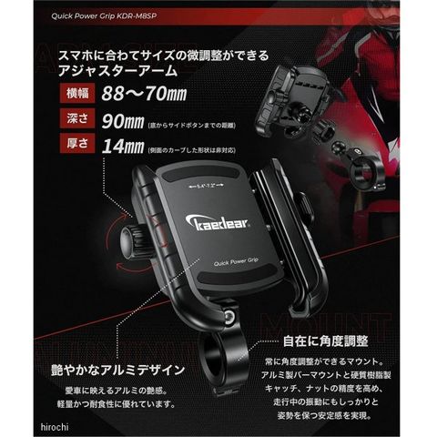 ライディングの合間、食事や休憩、散策などする場合、バイクに取り付けたスマホは基本的には取り外して持ち歩くことが多いと思います。その際、スムーズに脱着できないばかりに、焦って外したり不十分に装着したためにスマホを落下させて破損させてしまっては元も子もありません。カエディアKDR-M8SPはワンタッチレバーの操作だけでスマホの脱着が可能。アームを押し広げたり、ネジを回して固定する煩わしさがありません。コスパに優れたシンプル構造のホルダーでストレスのないオートバイライフを。