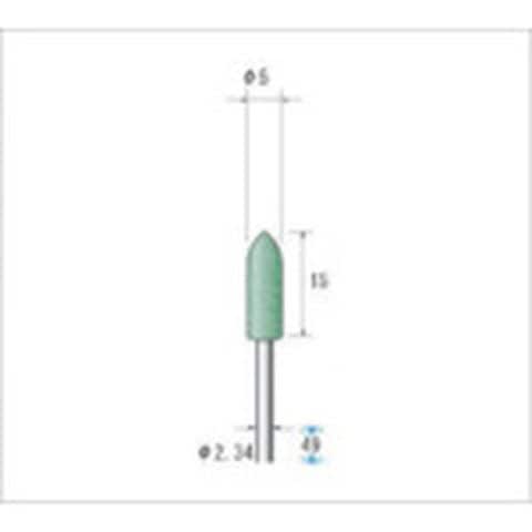 ・粒度(#):220・形状:砲弾・外径(mm):5・幅(mm):15・軸径(mm):2.34・最高使用回転数(rpm):30000・硬さ:ソフト・色:グリーン・全長(mm):49