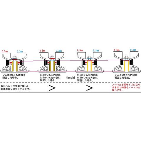 プーリーのセンターに位置するプーリーボスの長さを変える事によって、ドライブベルトをよりプーリーの外側に移動させる事が可能になり、最高速アップが望めます。また、2枚付属しているシムの取付位置により、細かな特性のセッティングが可能です。