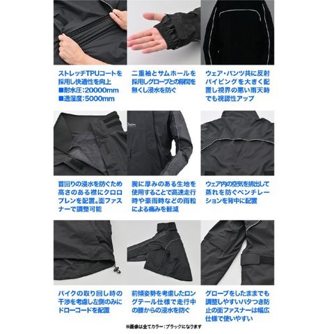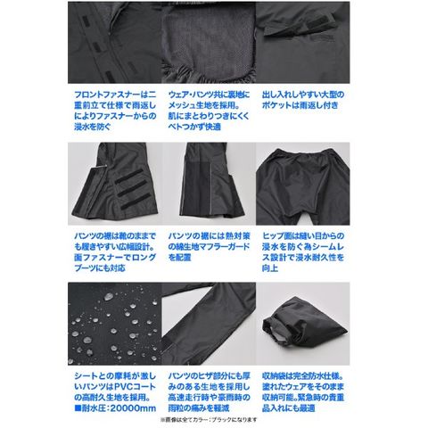ジャケットは、動きやすいストレッチ生地を使用し、斜めに配置したフロントフラップがファスナーからの浸水を防止。首元には内側がクロロプレン素材の高い襟を採用し、袖口は二重袖とサムホール、裾は二重裾とドローコードで雨滴の侵入を防ぎます。背中のベンチレーションがムレを防ぎ、バタツキを防ぐ幅広の面ファスナーはグローブでも使いやすい設計です。パンツは、摩耗に強いPVCコート生地を使用し、裾はロングブーツでも履きやすい幅広の面ファスナー仕様。熱に強い綿生地のマフラーガードも装備しています。腕とひざには厚手の生地を使うことで雨滴による痛みを軽減。雨天時の視認性を高める反射パイピングも装備しました。収納袋は完全防水仕様で、小物バッグとしても利用可能です。
