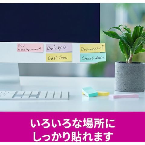 ・カラフルな4色のセットなので、色で識別したり、書いた部分を目立たせたりすることができます。・粘着力が2倍(当社通常粘着製品比)なので、つきにくい場所にもしっかりと貼れます。・紙製のふせんなので、筆記具を選ばずに使用できます。