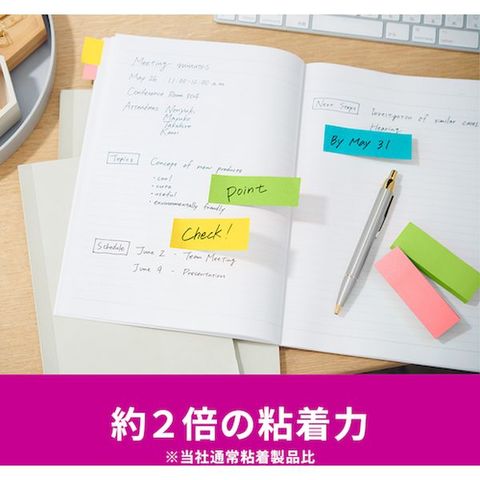 ・カラフルな4色のセットなので、色で識別したり、書いた部分を目立たせたりすることができます。・粘着力が2倍(当社通常粘着製品比)なので、つきにくい場所にもしっかりと貼れます。・紙製のふせんなので、筆記具を選ばずに使用できます。