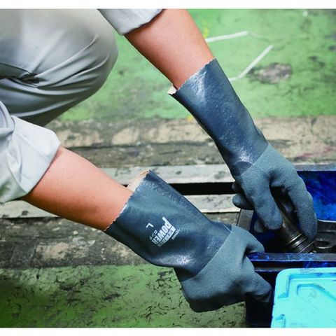 ・ニトリルゴム製で、耐油性・耐摩耗性・突き刺しに強さを発揮します。・全長が長く、袖口の汚れを防ぎます。・細かな凹凸の特殊すべり止め加工(マイクロフィニッシュ[[R上]])が、水や油から滑りにくくします。