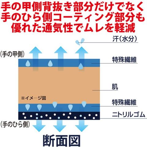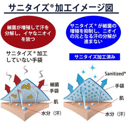 ・汗を吸収&放出する特殊繊維を使用しているため、従来の手袋よりさらさら感がアップしています。・サニタイズ[[R上]]加工により、抗菌抑臭効果があります。・伸縮性があり手にぴったりフィットします。・ニトリルゴムをコーティングしているため、耐摩耗性に優れています。