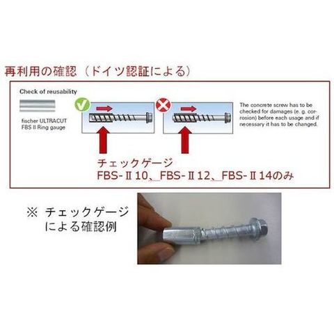 ・打込み不要、ねじ込みタイプの高耐力アンカーです。・インパクトレンチでの打設が可能です。・打設後の撤去が容易で仮設用としても使用可能です。・コンクリート孔内へ迅速にカットしていく鋸歯形状です。・アンカー距離とへりあき距離を小さく出来る非拡張アンカーです。・専用のチェックゲージを使用すれば再使用可能です。・欧州耐震性C1、C2と同様のアプリケーションに適用するETA評価です。