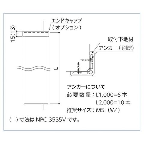 ・エンドキャップは別売です。・取付ねじ、アンカー類は別途ご用意ください。・直射日光や常に雨のかかる屋外、また浴室での使用は避けてください。・マイナス5℃以下の環境では使用することはできません。