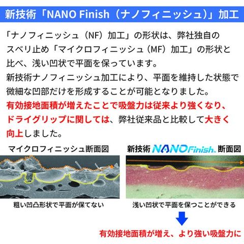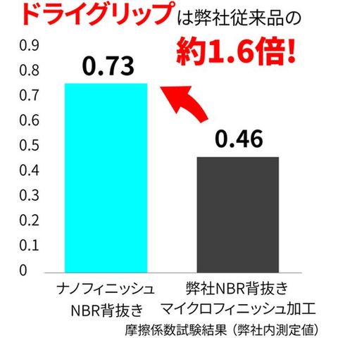 ・ドライグリップ力に優れた、新開発ナノフィニッシュ加工を採用しています。・新開発ナノフィニッシュ加工のスベリ止め形状は、浅い凹状で平面を保つことで有効設置面積を稼いでおり、従来の滑り止め加工と比べて高い吸盤力を発揮します。・新開発ナノフィニッシュ加工は、従来の弊社NBR背抜きマイクロフィニッシュ加工と比較して、約1.6倍のドライグリップ力を発揮します。・摩耗強度は弊社従来品と比較して約30%アップし、耐久性が増すとともに、擦っても削れにくい滑り止めに改善されています。・コーティングに採用されている軟化配合と、伸縮性の良いポリウレタン弾性糸、ナイロン糸、15ゲージ編手の組み合わせが、抜群のフィット感を生み出しています。・ナイロンとポリウレタン弾性糸の15ゲージ編手で指にしっかりとフィットし、指先の細かな作業も可能にします。・コーティング部分は2層コートの構造で、液体が染み込みにくくなっています。・従来のNBRマイクロフィニッシュ加工に対し、スベリ止めの凹部に詰まるチリ、ホコリ、ゴミなどの問題は大きく改善されています。・菌の繁殖を抑制し、汗などによるニオイを防ぐサニタイズ抗菌抑臭加工を施しています。・ナノフィニッシュ加工は、揮発性有機化合物含有率が1%未満の「VOCフリー」で、世界水準の繊維製品の安全性を証明するエコテックス認証登録商品であることから、環境と安全に配慮した製品です。
