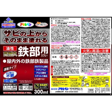 ・サビの上からそのまま塗れる、サビドメ兼用の鉄部用スプレーです。・シリコンアクリル樹脂採用で耐候性に優れています。・密着力が強く、ガルバリウム鋼板やトタン、アルミ、ステンレスにも塗装できます。・1回塗りに仕上がりますので、作業性抜群です。