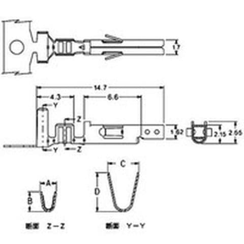・適用電線(AWG):#18~#24・B(mm):2.30・被覆外径(mm):1.3~3.1・C(mm):3.6・A(mm):1.9・D(mm):4.5・適合手動圧着工具:57026-5000、57027-5000