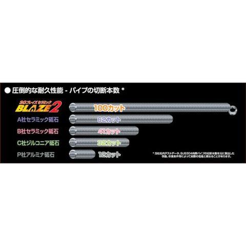 ・新世代セラミック砥粒「SGブレイズ」とBIAボンドのコンビで最強の耐久性を発揮します。・「切断砥石 SGブレイズ」が性能アップしてリニューアルしました。・一般アルミナ砥石比約8倍の耐久性を実証します。・耐熱性が高いため、一般鋼の切断で特に耐久性を発揮します。