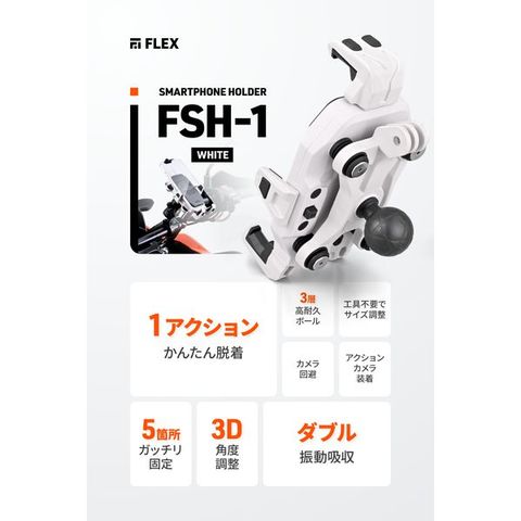 デイトナ バイク用 iPhone16 ProMax スマホホルダー 振動吸収 3D角度調整 5点支持 クッションアーム フレックス FSH-1 ホワイト
