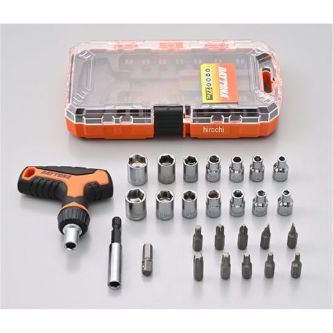 狭いスペースでも作業しやすい手のひらサイズのミニラチェットTハンドルと、六角ソケット、10種類のビットなどを組み合わせたツールセット。六角ソケットは、ミリサイズ、インチサイズ各7種類の複合セットです。全長60mmの磁気付きエクステンションバーも付属するので、奥まった場所の作業も可能です。