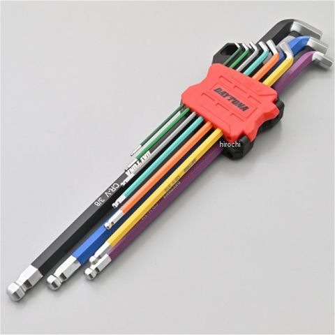 レインボーでサイズが分かりやすい。片側108°ショートで高さが出ないため、奥まった箇所の使用時に便利。ボールポイント加工側は、傾けた状態でもスムーズに作業できます。