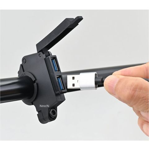 USB QC 3.0×2の2ポートで、1ポートあたり最大30W(5V/3A、9V/3A、12V/2.5A)の高出力。メインキーに連動するのでバッテリー上がりの心配もありません。ブレーキスイッチに付属ハーネスを接続し、フレームのボルトに共締めするだけなので取り付けも簡単。対応ハンドル径φ22.2~28.6独自の開閉ギミックが使用後の閉め忘れを防ぎます。