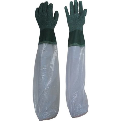・手袋部は塩化ビニールをコーティングしているため、天然ゴム製の手袋に比べて油に強く、耐摩耗性に優れています。・指・手のひらに特殊すべり止め加工を施しているため、グリップ性に優れています。・特殊溶着加工で手袋部分と腕カバーを溶着して一体化しているため、水が入らず汚れ・水を伴う作業に適しています。・袖口がゴムバンド付のため、作業中に脱げ落ち、ずり落ちを防ぎます。