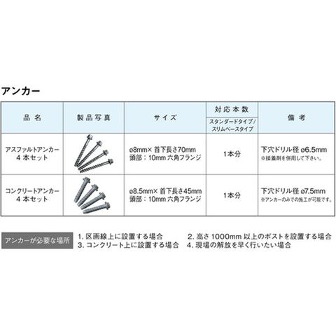 ・アンカーが必要な場所、区画線上・高さ1000mm以上のポスト・コンクリート上・併用開始を早くしたい場合。