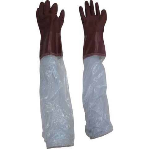 ・手袋部はハードな作業に適した丈夫なタイプです。・手袋部は塩化ビニールをコーティングしているため、天然ゴム製の手袋に比べて油に強く、耐摩耗性に優れています。・指先、手のひらのすべり止め加工で、優れたグリップ力を発揮します。・手袋部分と腕カバーを特殊溶着加工で一体化しているので、水が入らず、汚れ・水を伴う仕事にピッタリです。・袖口がゴムバンド付ですので、作業中の脱げ落ち、ずれ落ちを防ぎます。