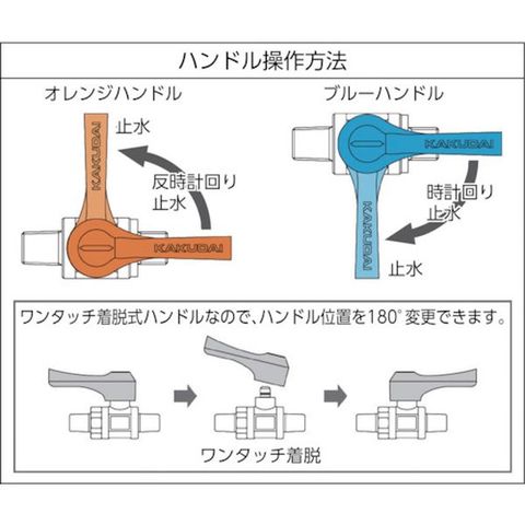 ・使用圧力:0~1.0MPa・ワンタッチ着脱式ハンドル・耐熱温度:1~80℃・オレンジハンドル:反時計回り止水、ブルーハンドル:時計回り止水