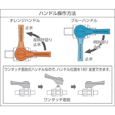 ・先端回転式・最高圧力:1.0MPa・ワンタッチ着脱式ハンドル・耐熱温度:1~80℃・オレンジハンドル:反時計回り止水、ブルーハンドル:時計回り止水