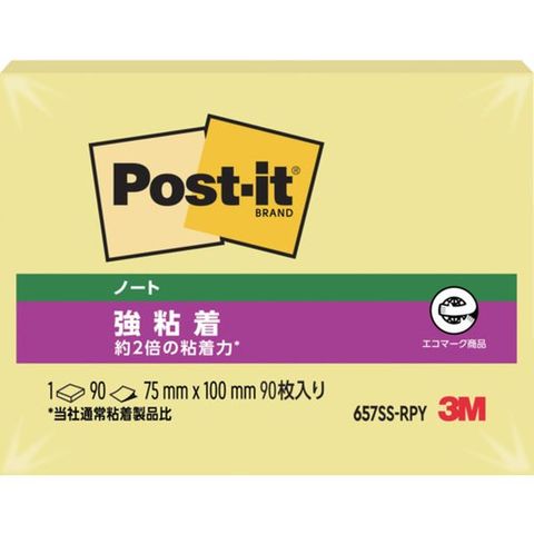 657SSRPY 829-1096 スリーエム 3M ポスト・イット 強粘着 75X100mm 90枚 イエロー