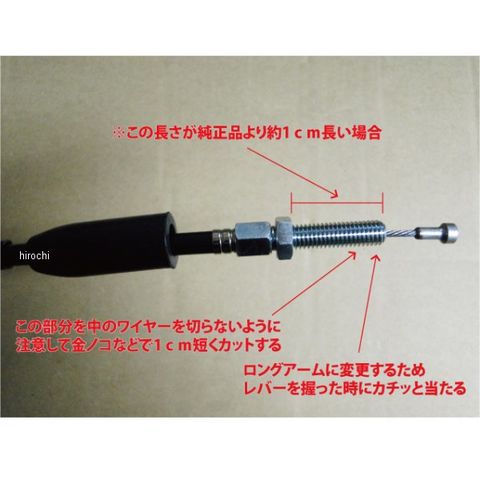 ロングアームにしたことで純正のクラッチワイヤーは特に問題ありませんが社外品のクラッチワイヤーの場合、金具(ねじ山部分)が純正より1cm長く作って入るためクラッチワイヤーを握った時にカチッと金具に当りますので金具が当らない位まで短く加工してして頂きますようお願い致します。