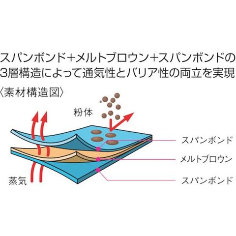・素材は耐薬品性に優れたポリプロピレン100%で軽くて丈夫です。・水は通さず空気だけ通すSMS製法による三重構造で作られています。・0.3ミクロン以上のダストを99%バリアします。