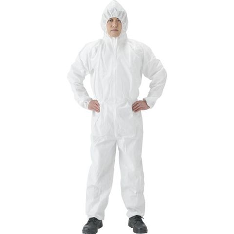 ・JIS T 8115規格タイプ5~6適合品・フード、袖、ウエスト、スソにゴム入り・使い捨てタイプ・粉体ガード