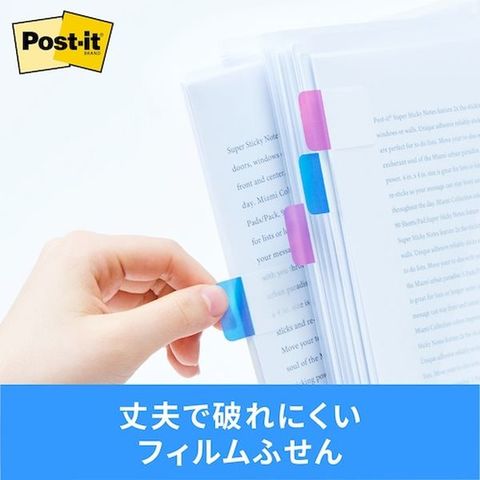 ・丈夫で破れにくい、フィルム素材のポスト・イット[[R上]]製品です。・貼ると透明になり下の絵や文字を隠しません。・1枚ずつ取り出せるポップアップ式です。・しっかりとした厚みの素材で折れにくく安心です。・散らばりがちな書類をスッキリ整理できます。・厚口のよりしっかりしたフィルム素材使用なので、本や雑誌、資料ファイルの外に出ていても折れにくく安心です。・色分けして、見た目もスッキリなファイリングが実現できます。・よりしっかりした厚口のフィルム製です。・水分散性粘着剤を使用しています。