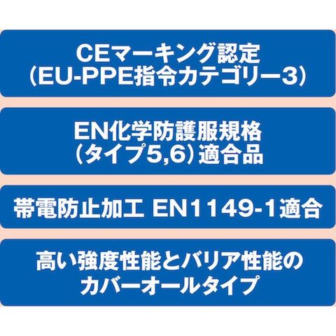 ・CEマーキング(CE0120)認定・使い捨てタイプ・EN化学防護服規格(PPE指令)タイプ6(「スプレーなどの軽いしぶき(ミスト)」に限って保護)タイプ5(「粒子」に限って保護)適合品・帯電防止加工 EU規格 EN1149‐1適合品