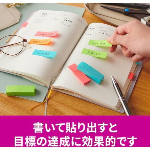 ・カラフルな4色のセットなので、色で識別したり、書いた部分を目立たせたりすることができます。・粘着力が2倍(当社通常粘着製品比)なので、つきにくい場所にもしっかりと貼れます。・紙製のふせんなので、筆記具を選ばずに使用できます。