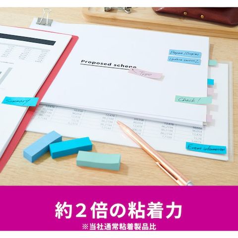 ・カラフルな4色のセットなので、色で識別したり、書いた部分を目立たせたりすることができます。・粘着力が2倍(当社通常粘着製品比)なので、つきにくい場所にもしっかりと貼れます。・紙製のふせんなので、筆記具を選ばずに使用できます。